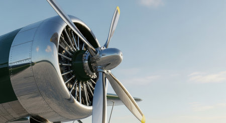 A close up view of a polished vintage propeller engine with shiny chrome details and a classic design, set against a clear blue sky. Represents aviation history and travel.