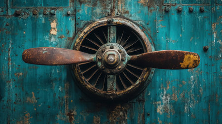 This striking image showcases a vintage airplane propeller mounted against a rustic blue background, capturing the essence of aviation history and craftsmanship.