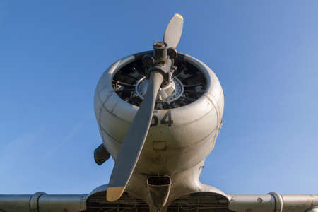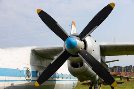 Engine and propeller of the old retro transport plane close-up. Fragment of the aircraft.