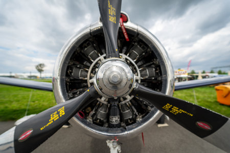 Powerful airplane radial engine is shown with propeller blades in front