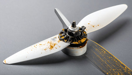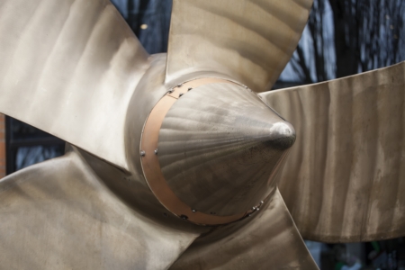 Large metallic propellor with blue background.