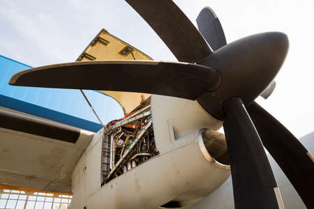 Aircraft engine maintenance. Airplane engine with propeller gets a repair. Military jet.