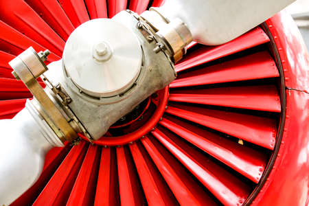 detail of old airplane engine with propeller. Close up of a red plane propeller. Damaged jet engine on large aircraft. World War II era heavy bomber engine and propeller closeup. High quality photo
