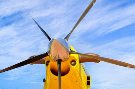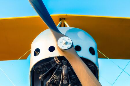 propeller with engine and yellow wings of a vintage airplane on a blue background close up