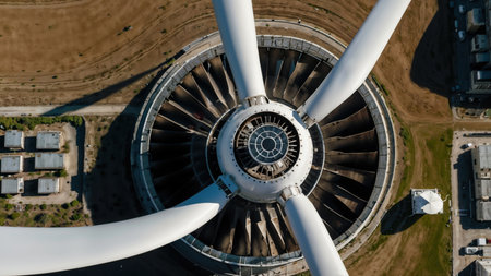 Aerial view of the turbine of a modern airplane. Drone photography.