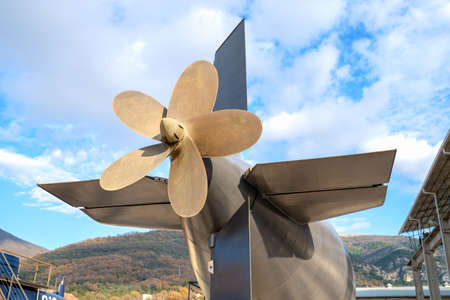 Close up view of submarine screw, settled on the Mediterranean embankment under the bright blue sky. Outdoors.