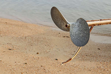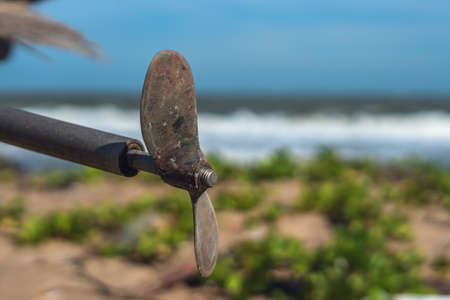 Outboard motor asia boat engine old rusty steel propeller two blades on metal rod hangs. Nature background. Device with rotating hub and radiating blades set at pitch to form helical spiral rotated