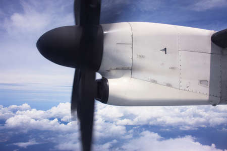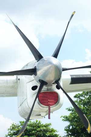 Airplane propeller engine against blue sky with clouds closeup