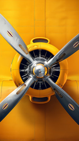 Close Up Image of Vintage Aircraft Engine with Yellow Cowling and Polished Metal Propeller Blades Showcasing Classic Aviation Engineering and Retro Design Elements AI Generative