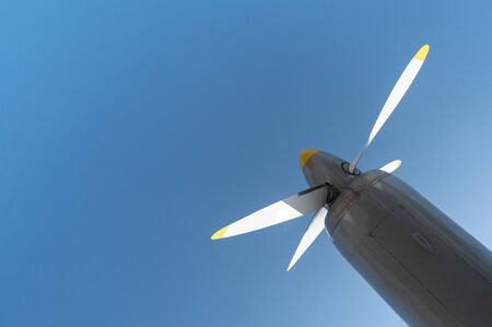 Airplane propeller of military aircraft, copy space. Blue sky background.