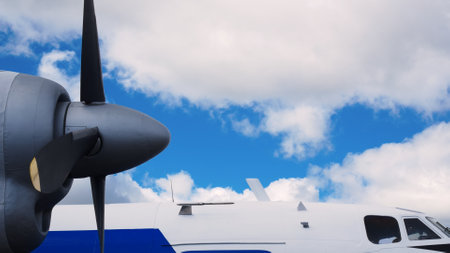 Low angle view of an airplane propeller engine against a cloudy sky, highlighting the mechanical components and design of the aviation vehicle.