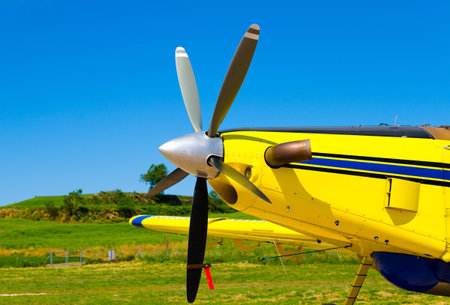Close up abstract of a vintage airplane propeller engine against blue sky, closeup. Travel concept