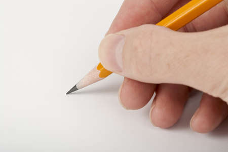 Man`s hand writing with pencil on white background