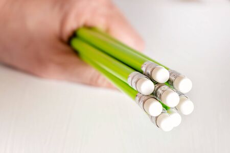 In your hand, green pencils with elastic bands eraser at the end, for erasing after drawing with a pencil. Copy of the space. The concept of creativity.