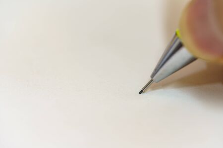 Male hand holding simple pencil ready to draw something on white paper macro