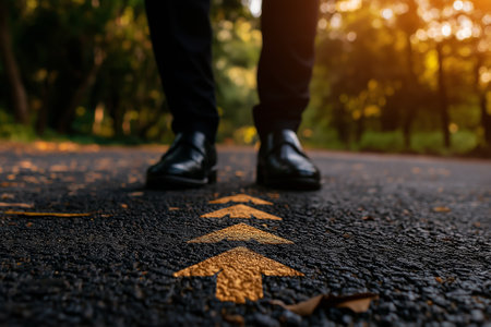 A businessman stands on road with yellow arrows pointing forward, symbolizing direction and decision making. warm sunlight creates hopeful atmosphere