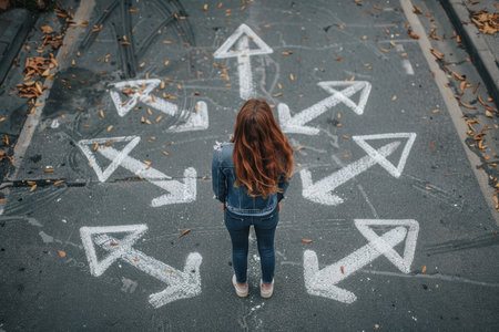 A woman stands on asphalt, contemplating two directional arrows, symbolizing choices and decisions. scene evokes sense of introspection and uncertainty