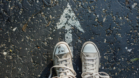 A pair of stylish sneakers rests on a textured pavement, surrounded by directional arrows painted in white. This image captures the essence of youth culture and decision-making, appealing to a Gen Z audience. ai generated.