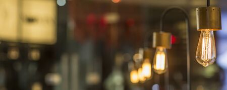 Decorative light bulb glowing in cafe. Idea for shop decoration. Vintage tone