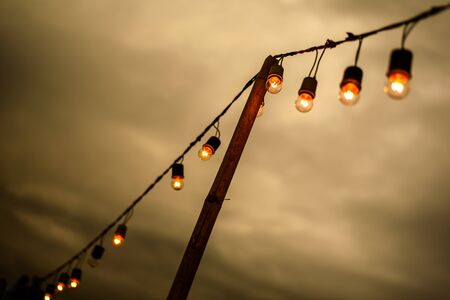 Background image of outdoor lighting garlands, focus on classic light bulb with wiring. Copy space.