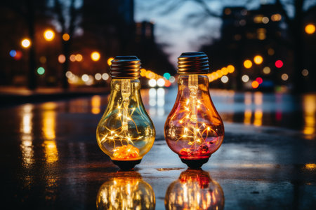 A stunning close-up of a vintage light bulb glowing against a dynamic background of colorful light trails, creating a captivating night scene.