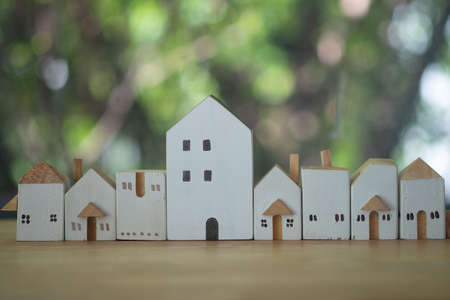 Group of mini wooden home model placed on wooden table with lighting morning and shadow. House ownership or real estate business concept