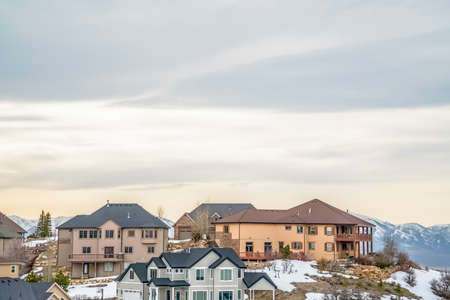Multi storey homes built on a snow covered slope against cloudy sky in winter. View of a snow capped mountain can be seen in the background.