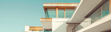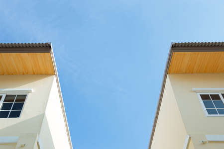 Panorama frame Exterior of upper storey of townhomes with blue sky background on a sunny day. The townhouses have pitched roofs, square windows, and blue and cream wall.