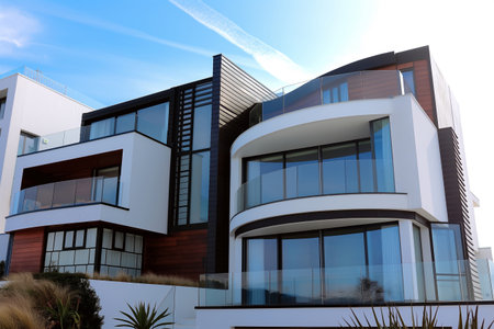 Modern Luxury House with Glass Balconies and Sleek Architectural Design.