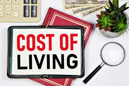 Cost of living. The inscription in the planning notebook On the background of cash and a calculator. Calculation of expenses for home financing.