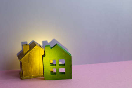 House model on purple desk. purple wall background. real estate concept