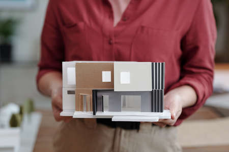 Close-up of unrecognizable woman in burgundy shirt holding cardboard model of cottage house with black panels