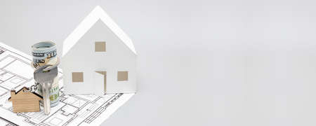 The concept of mortgage, sale and rental of housing and real estate. A mock-up of house with keys and a keychain in the shape of a house with dollars on a gray background. Banner format. Copy space