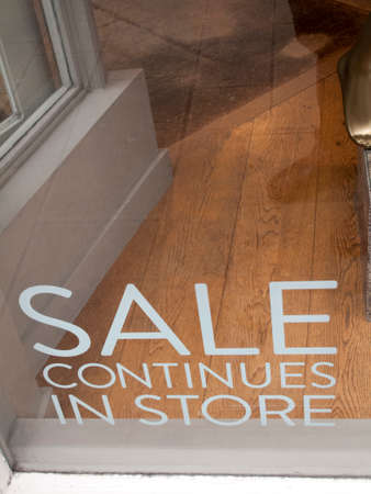 Sale continues in store sign in clothing retail shop window