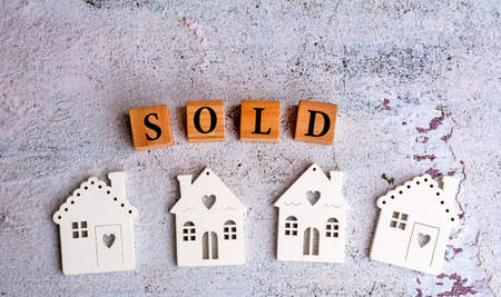 Sold word on wooden cubes and miniature houses on gray textured background . Housing concept