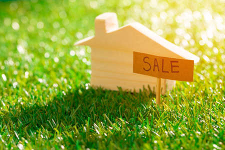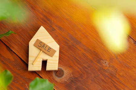 Sale of house. Wooden house model with a label SALE
