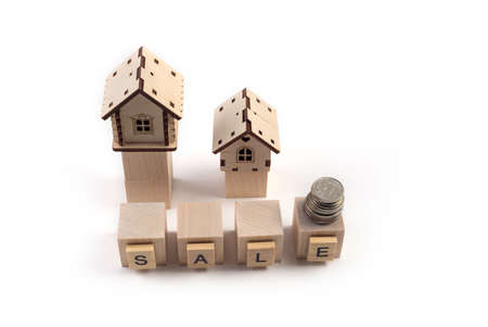 Wooden blocks with the word Sale and wooden miniature houses. The concept of the sell of real estate, apartments and residential premises. Rent and mortgage. Market analysis