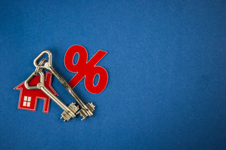 top view. Model house with red sign percent. Mortgage and interest on the house. buy of property, home, real estate. affordable housing. advantageous offer from the bank. copy space