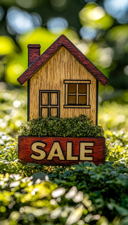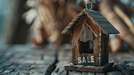 a small house adorned with a vibrant red SALE tag against a rustic wooden background, signaling a unique chance for prospective buyers to make this cozy dwelling their own.