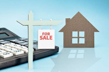 The concept of mortgage, sale and rental of housing and real estate. Mortgage credit lending. Calculator and a signboard for the sale or rent of a house. Copy space