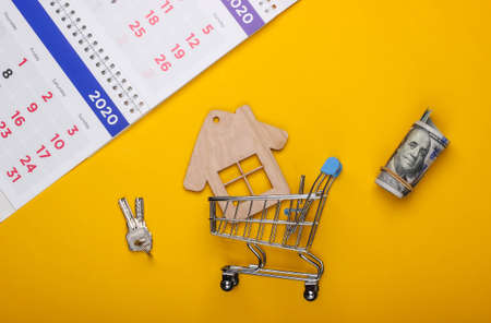 Buying a house. Payment of rent for housing. Mini house figurine, shopping trolley with calendar on yellow background. Top view