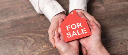 Hands holding a house for sale; Concept of house for sale