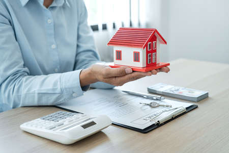 Female real estate agent is use hands holding house of red roof for the concept of real estate investment about house trading, purchase contract and house insurance