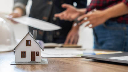Closeup view of new house model a discussion with a real estate agent, Home sales and home insurance concept.