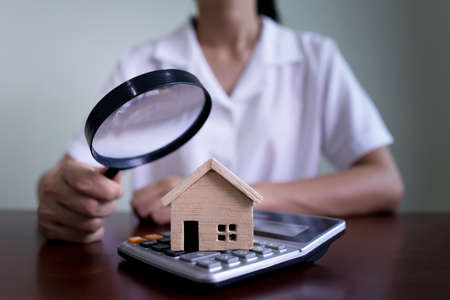 Woman using a magnifying glass to house model and calculator. Searching housing and home insurance concept.