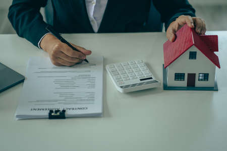 Real estate agents and borrowing, debt contracts and housing investments. Loan Agreement for Investors or Buyers to sign for bank approval, idea of ​​renting a home and selling a home.