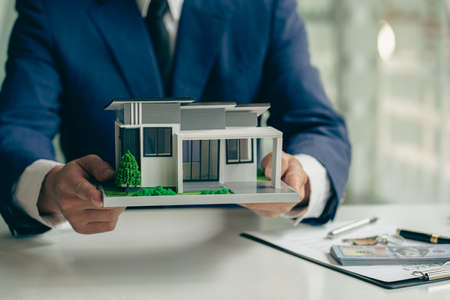 Estate agent sending house model to client after signing agreement contract real estate with approved mortgage application form, concerning mortgage loan offer for and house insurance.