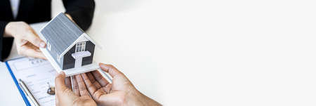 A female home salesman handing over a gray small house model with two hands to the customer after the purchase contract is signed, real estate trading ideas. Banner background with copy space.