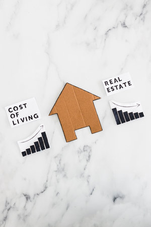 graphs with cost of living going up and real estate transaction going down next to cardboard house, concept of post pandemic economy during winter 2022