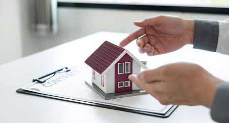 Real estate agents are carrying a housing model of the project to be forwarded to customers as home delivery. Real estate trading ideas and bank loans for buying and selling houses and land.